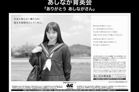 | 透過分佈全國不知名的親人,有八萬人以上的孩童得以繼續升學並築夢。我們除了要傳達Ashinaga育英會的成績之外,更想對從那麼多「Ashinaga」獲得的無償之愛,重新表達感謝之意。 |